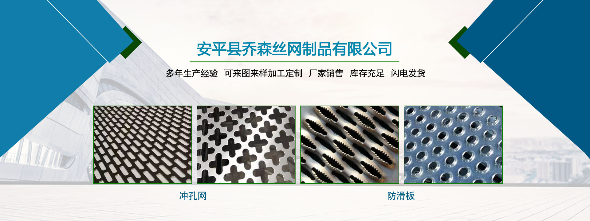 安平縣喬森絲網(wǎng)制品有限公司主營產(chǎn)品:篩網(wǎng)、金屬裝飾網(wǎng)、沖孔網(wǎng)板、防滑板和軋花網(wǎng)。常年現(xiàn)貨供應(yīng)45號黑鋼絲編織篩網(wǎng)、熱鍍鋅鋼絲篩網(wǎng)、304不銹鋼篩網(wǎng)和冷鍍鋅鐵絲網(wǎng),加工定做耐磨65號錳鋼絲篩網(wǎng)、菱形孔防堵篩網(wǎng)、養(yǎng)殖用長方孔鐵絲網(wǎng)、金屬裝飾網(wǎng)、盤條 礦篩網(wǎng)等各種鋼絲篩網(wǎng)和建筑用鐵絲網(wǎng)片,歡迎新老客戶前來咨詢洽談合作。